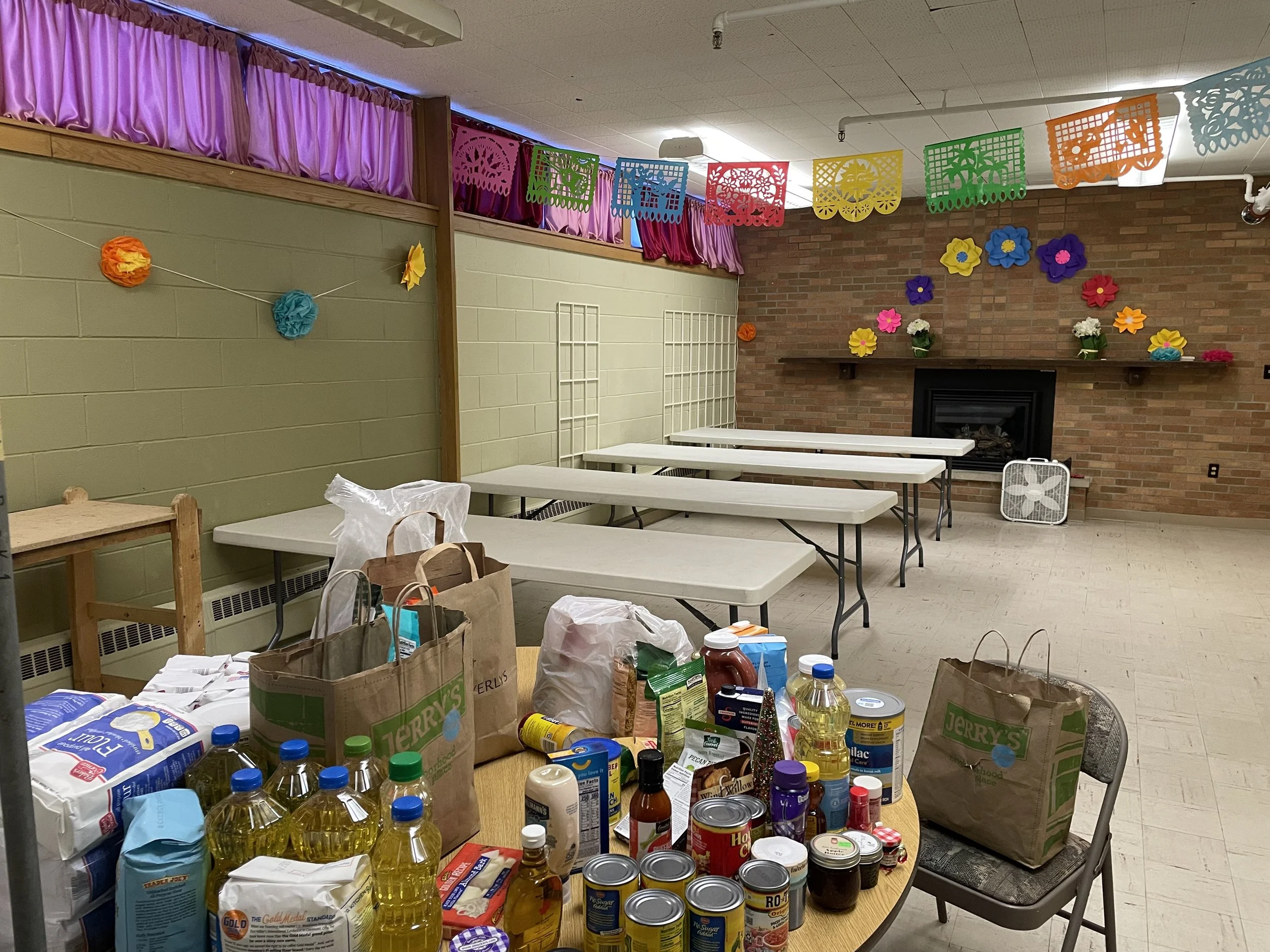 Tables and groceries at Casa Maria ready to be assembled and distributed.