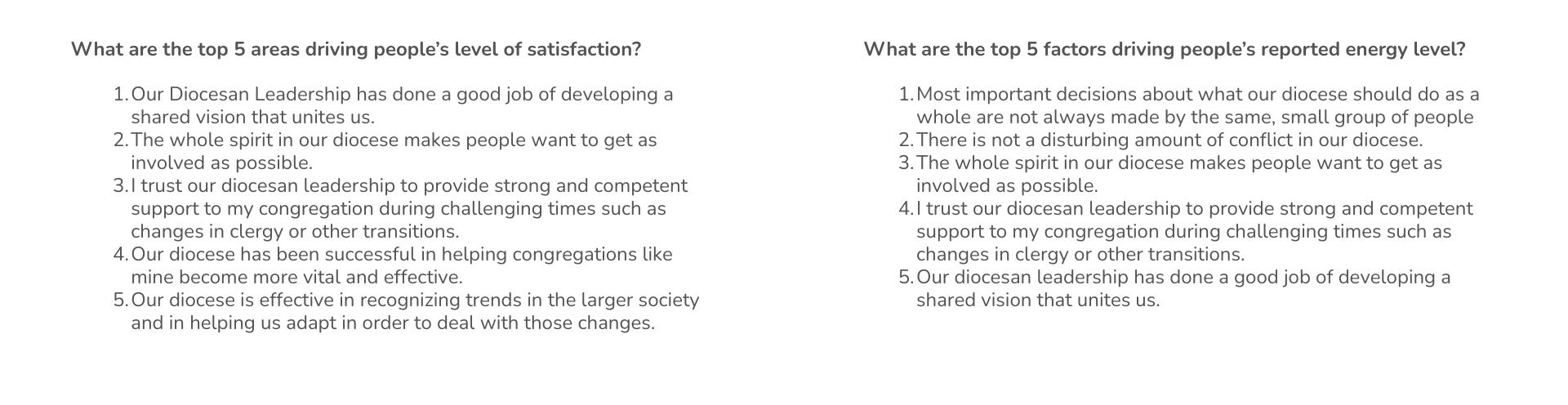 Summary: Effective leadership—clergy and lay—is seen as essential to growth, outreach, and public credibility. Some want the Diocese to empower local leaders with resources, while others feel diocesan leadership should avoid heavy-handedness. Visible, servant-minded leaders are highly valued. -