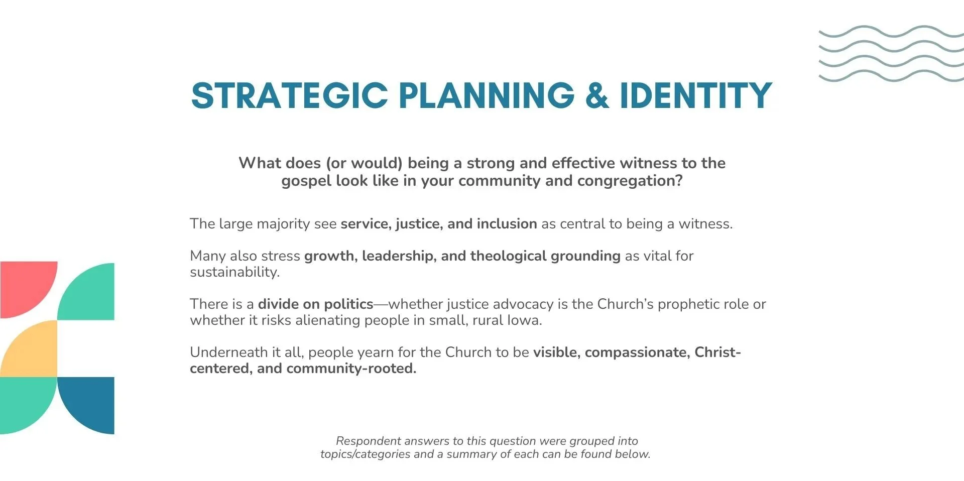 Summary: Witness also means clarity about identity—who we are as Episcopalians and Christians. Some emphasize distinctives like liturgy, while others highlight collaboration with other churches. The mission is to embody God’s love in ways both uniquely Episcopal and broadly ecumenical.