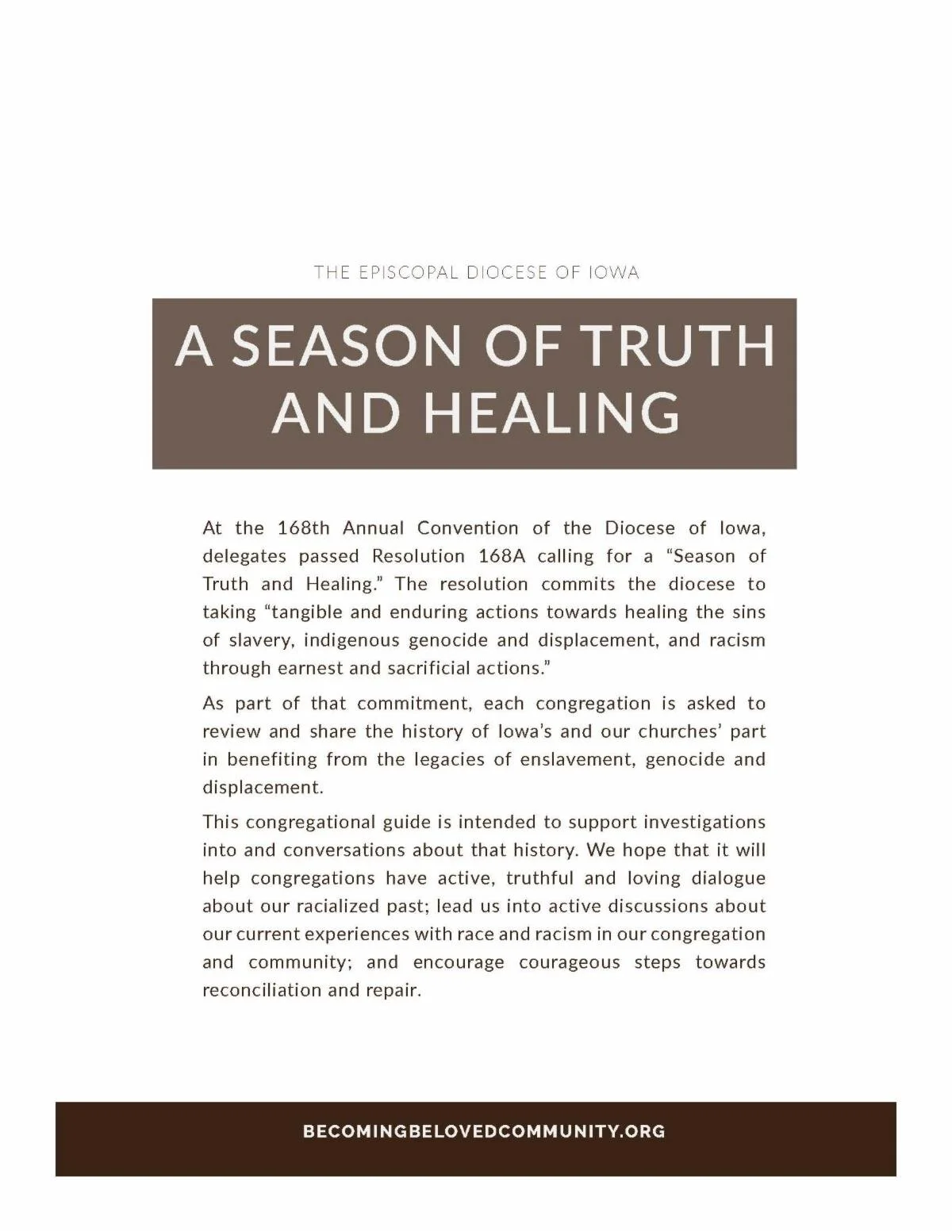 At the 168th Annual Convention of the Diocese of Iowa, delegates passed Resolution 168A calling for a “Season of Truth and Healing.” The resolution commits the diocese to taking “tangible and enduring actions towards healing the sins of slavery, indigenous genocide and displacement, and racism through earnest and sacrificial actions.”